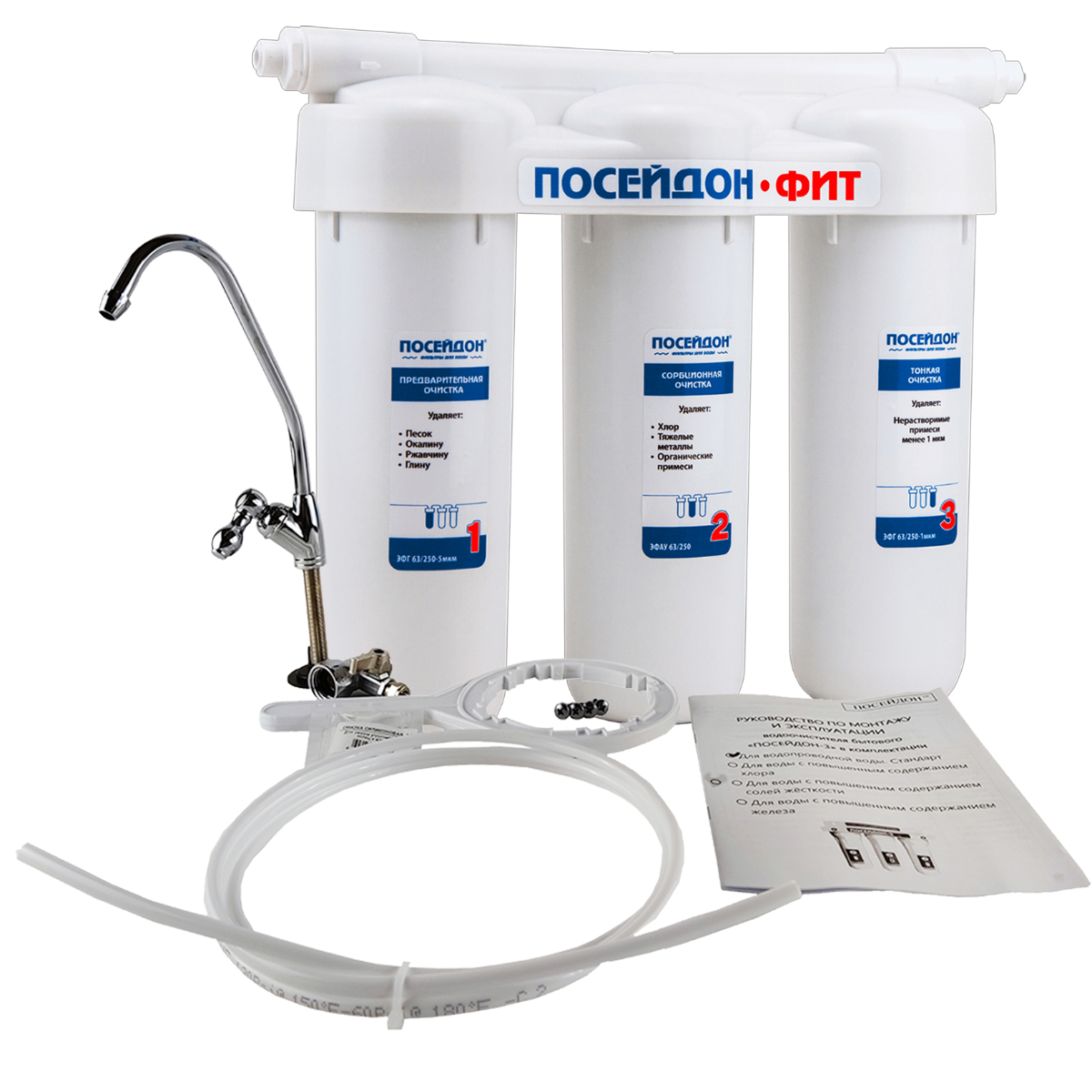 водоочиститель в сборе с комплектом фильтроэлементов (ЭФГ 63/250 5 мкм, ЭФАУ 63/250, ЭФМ 63/250), кран для чистой воды, трубка соединительная пластиковая (2 м), ключ, тройник-адаптер, шаровый вентиль, саморез с пресс-шайбой ∅4,2 х 16 (2 шт.) |