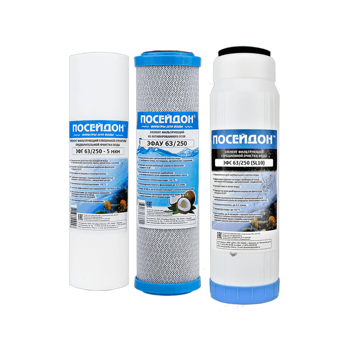 - картридж ЭФАУ 63/250 – удаляет хлор и органику, устраняет неприятные запахи и привкусы (сорбционная очистка);