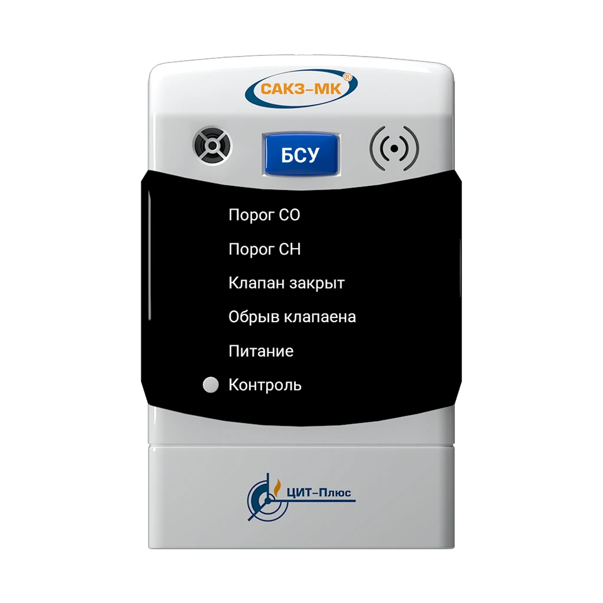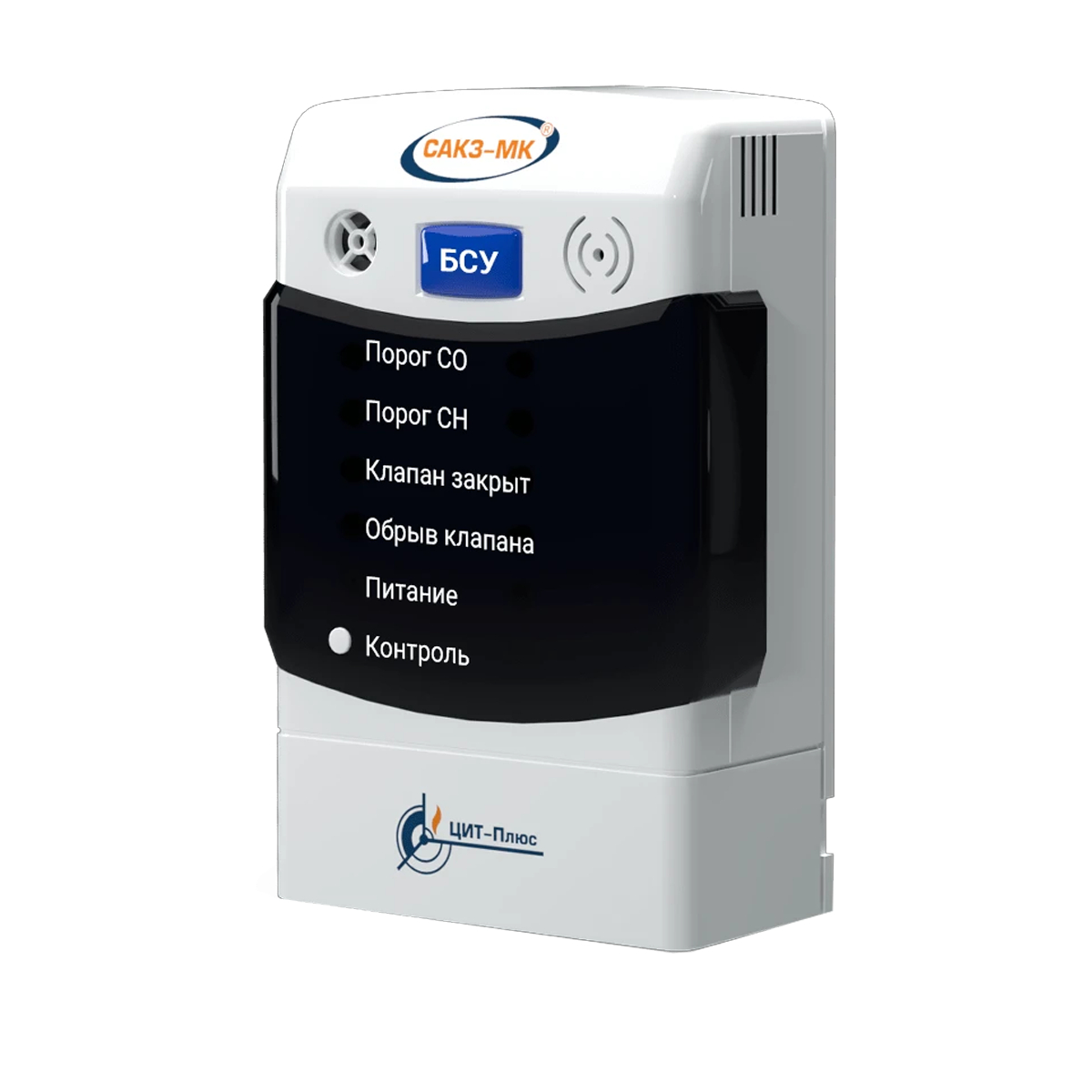 - на лицевой панели расположены индикаторы «Порог СО», «Порог СН», «Клапан закрыт», «Обрыв клапана», «Питание», а также встроенный звуковой излучатель;